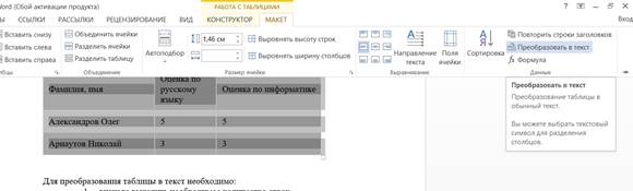 2. открыть вкладку Макет группа Данные → Преобразовать в текст →задать нужные параметры.