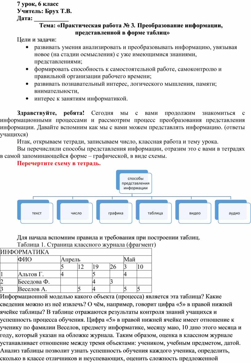 Тема: «Практическая работа № 3. Преобразование информации, представленной в форме таблиц»