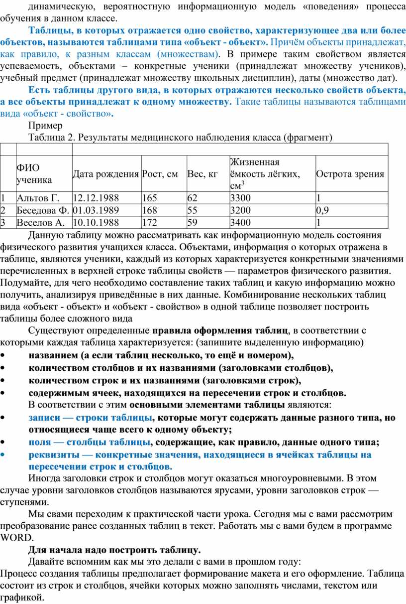 Данную таблицу можно рассматривать как информационную модель состояния физического развития учащихся класса. Объектами, информация о которых отражена в таблице, являются ученики, каждый из которых характеризуется конкретными значениями перечисленных в верхней строке таблицы свойств — параметров физического развития. Подумайте, для чего необходимо составление таких таблиц и какую информацию можно получить, анализируя приведённые в них данные. Комбинирование нескольких таблиц вида «объект - объект» и «объект - свойство» в одной таблице позволяет построить таблицы более сложного вида