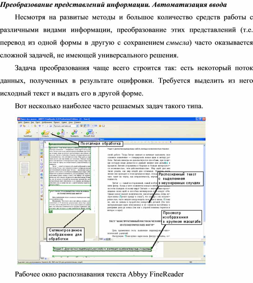 Задача преобразования чаще всего строится так: есть некоторый поток данных, полученных в результате оцифровки. Требуется выделить из него исходный текст и выдать его в другой форме.