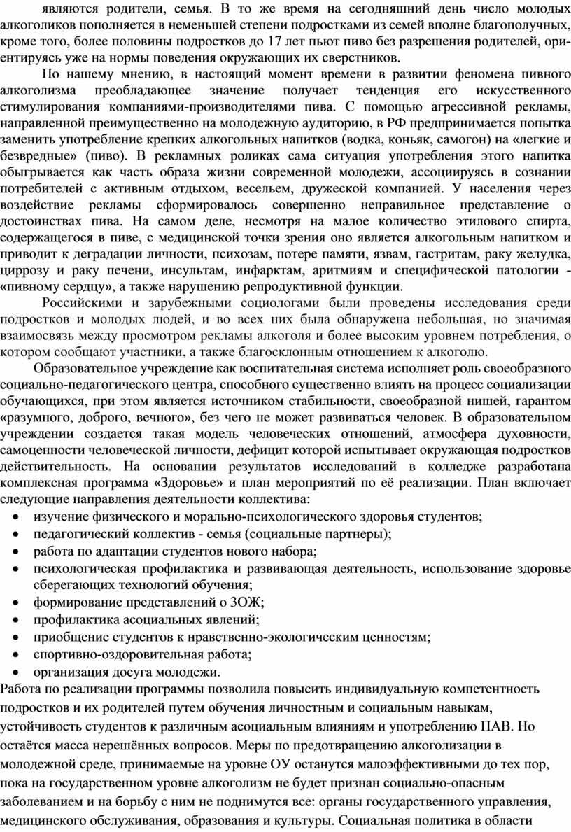 Работа по реализации программы позволила повысить индивидуальную компетентность подростков и их родителей путем обучения личностным и социальным навыкам, устойчивость студентов к различным асоциальным влияниям и употреблению ПАВ. Но остаётся масса нерешённых вопросов. Меры по предотвращению алкоголизации в молодежной среде, принимаемые на уровне ОУ останутся малоэффективными до тех пор, пока на государственном уровне алкоголизм не будет признан социально-опасным заболеванием и на борьбу с ним не поднимутся все: органы государственного управления, медицинского обслуживания, образования и культуры. Социальная политика в области здравоохранения должна бороться не только за физическое, но и за нравственное здоровье нового поколения, ограждая его не только от вредных продуктов, но и от воздействия тех лжеценностей, которые транслируются в общественное сознание в чьих-либо корыстных интересах.
