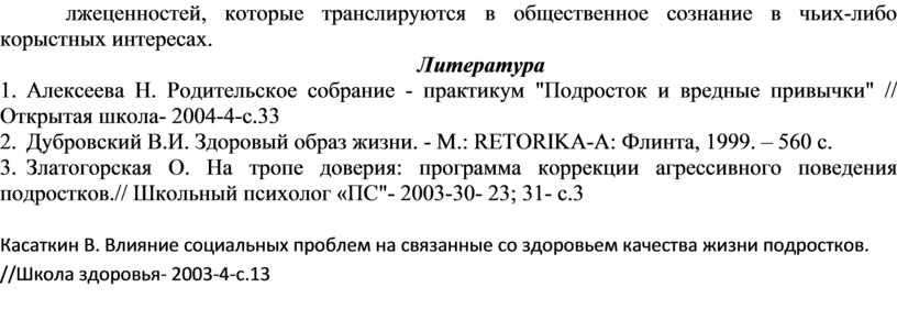 4. Касаткин В. Влияние социальных проблем на связанные со здоровьем качества жизни подростков. //Школа здоровья- 2003-4-с.13