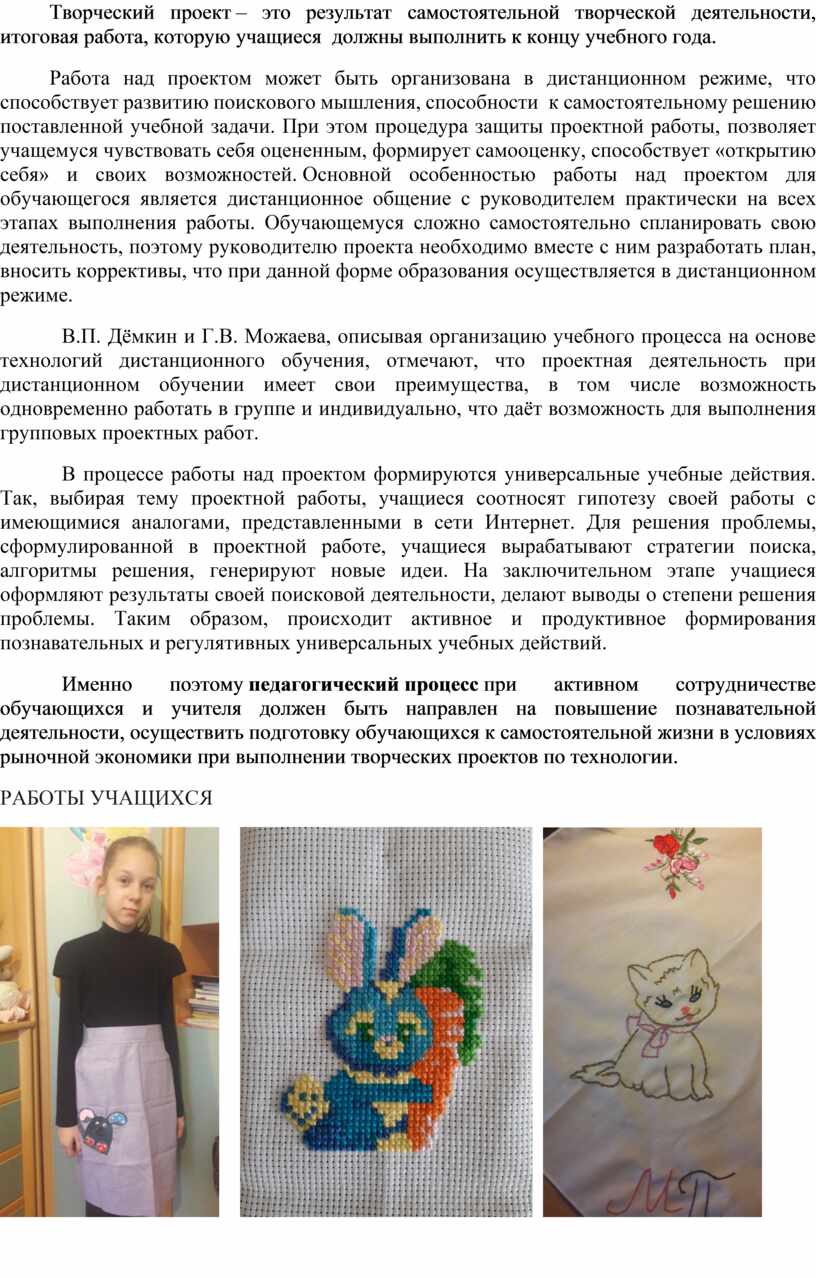 Работа над проектом может быть организована в дистанционном режиме, что способствует развитию поискового мышления, способности к самостоятельному решению поставленной учебной задачи. При этом процедура защиты проектной работы, позволяет учащемуся чувствовать себя оцененным, формирует самооценку, способствует «открытию себя» и своих возможностей. Основной особенностью работы над проектом для обучающегося является дистанционное общение с руководителем практически на всех этапах выполнения работы. Обучающемуся сложно самостоятельно спланировать свою деятельность, поэтому руководителю проекта необходимо вместе с ним разработать план, вносить коррективы, что при данной форме образования осуществляется в дистанционном режиме.