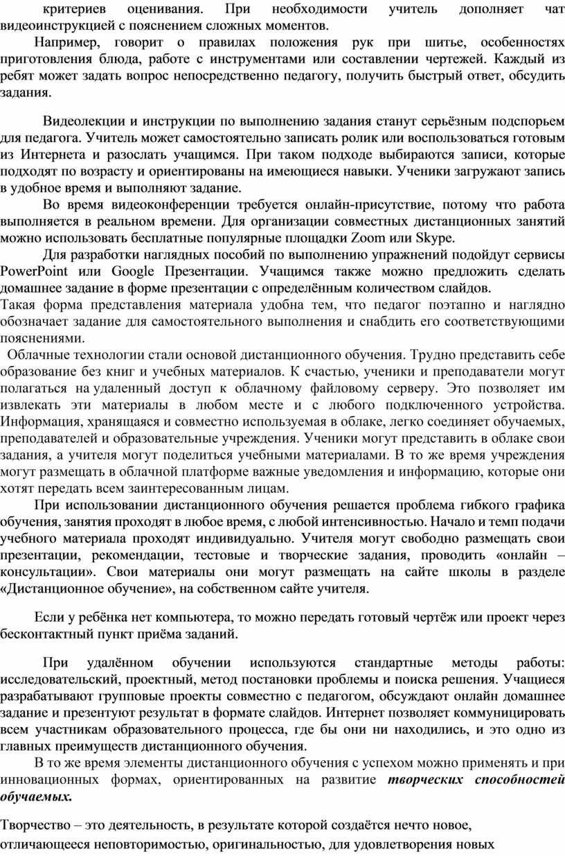 В отличие от точных наук, предмет технология является практико-ориентированным, следовательно, преподавание посредством технологий удалённого обучения представляет определённые сложности. Без личного присутствия педагогу сложно проконтролировать технологию выполнения заданий, приобретённые навыки учащихся и технику безопасности. Поэтому основная работа по выполнению заданий приходится на самих детей, а педагог разрабатывает контент и отправляет учащимся, а также осуществляет проверку выполненных заданий.