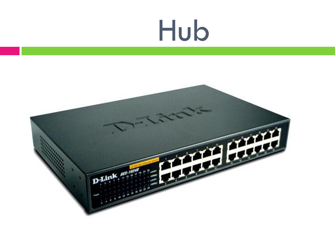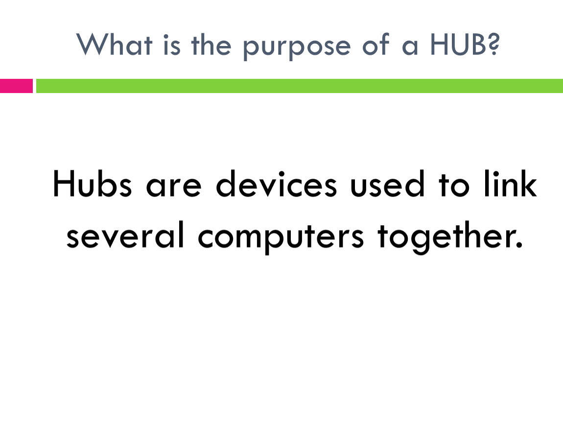 A hub repeats any signal that comes in on one device and copies it to all other devices connected to the hub.