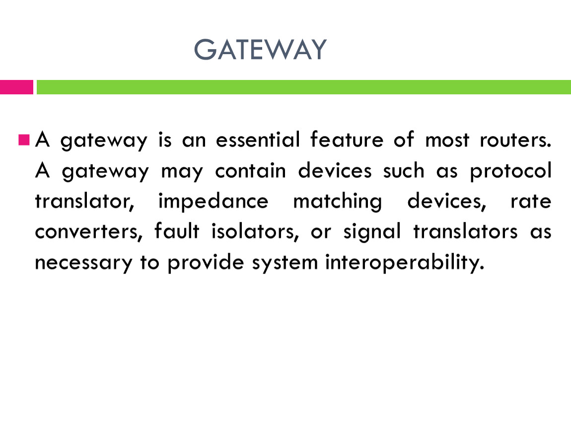 A gateway is an essential feature of most routers. A gateway may contain devices such as protocol translator, impedance matching devices, rate converters, fault isolators, or signal translators as necessary to provide system interoperability.
