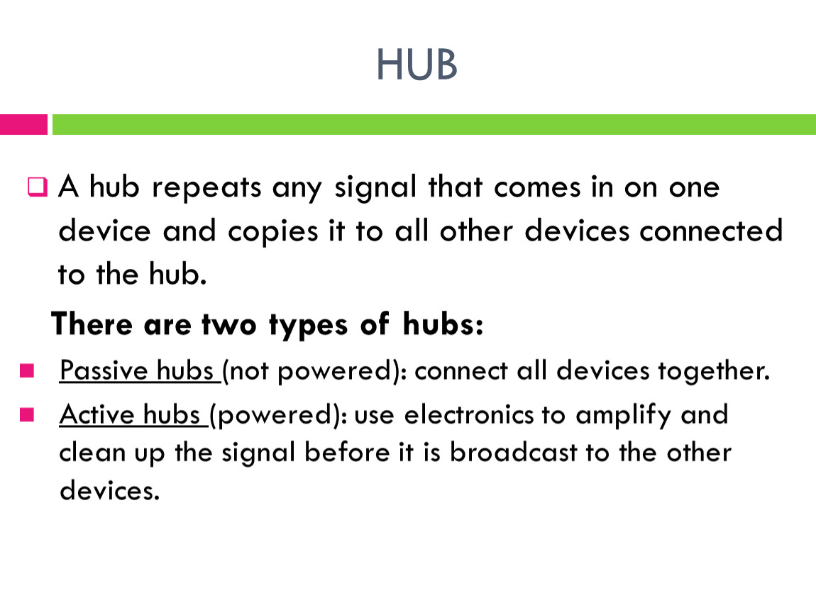 Active hubs (powered): use electronics to amplify and clean up the signal before it is broadcast to the other devices.