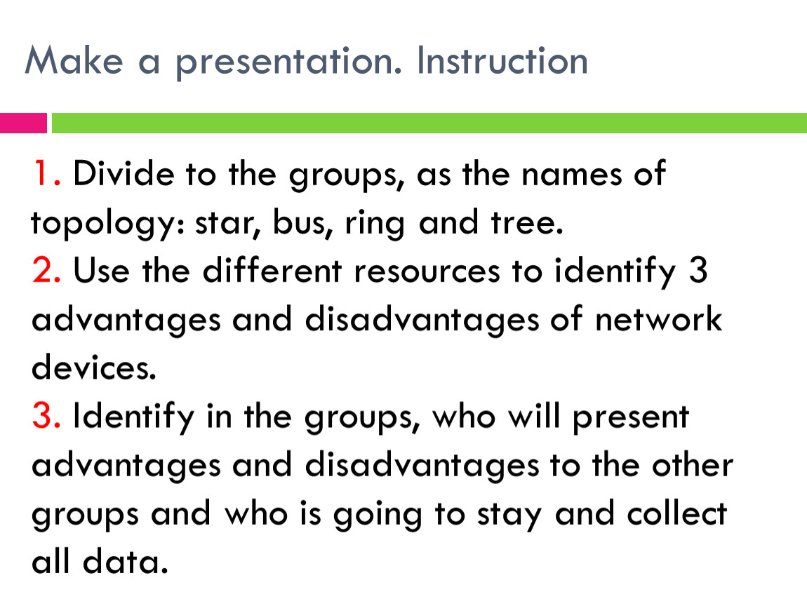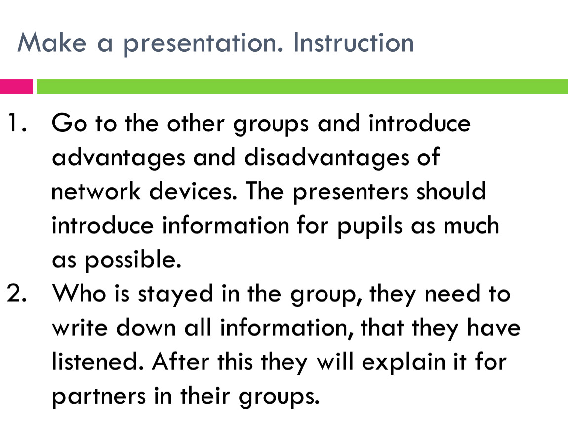 Go to the other groups and introduce advantages and disadvantages of network devices. The presenters should introduce information for pupils as much as possible.