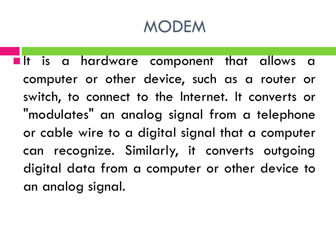 It is a hardware component that allows a computer or other device, such as a router or switch, to connect to the Internet. It converts or "modulates" an analog signal from a telephone or cable wire to a digital signal that a computer can recognize. Similarly, it converts outgoing digital data from a computer or other device to an analog signal.