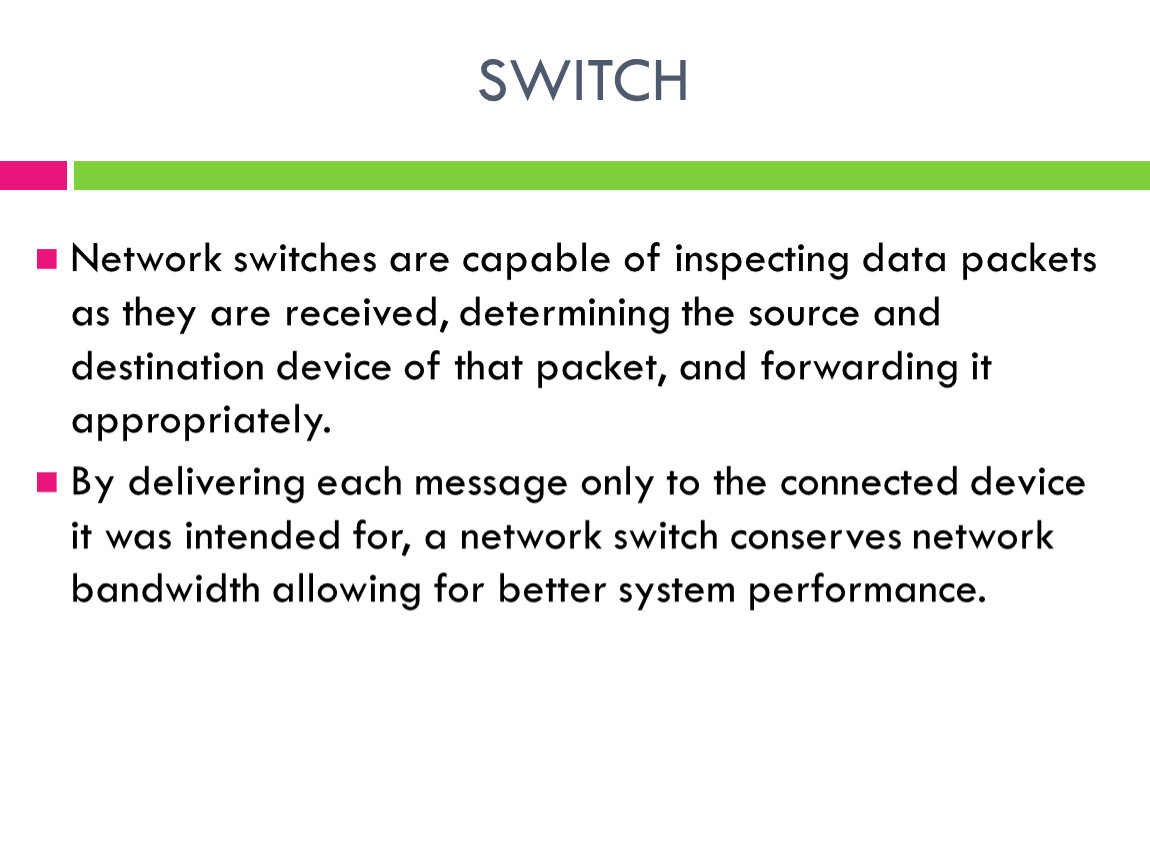 Network switches are capable of inspecting data packets as they are received, determining the source and destination device of that packet, and forwarding it appropriately.