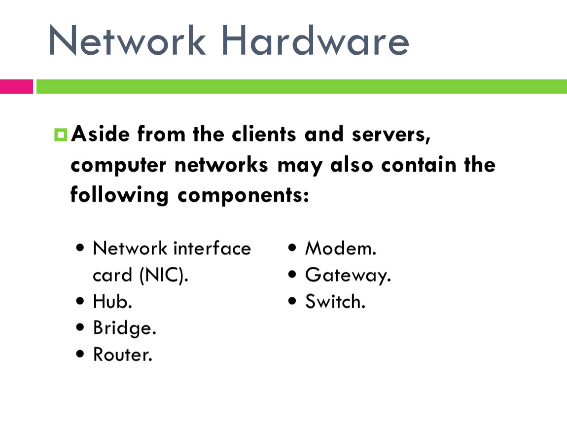 Aside from the clients and servers, computer networks may also contain the following components: