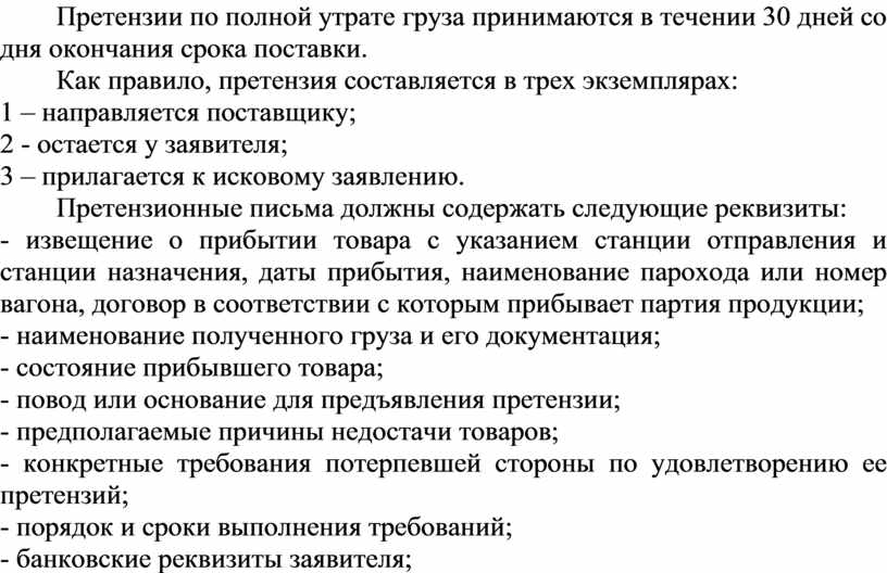 Претензии должны быть предъявлены в определенные сроки в зависимости от вида претензии. Например, претензии по количеству и качеству товаров предъявляются в течении 10 дней после составления коммерческого акта.