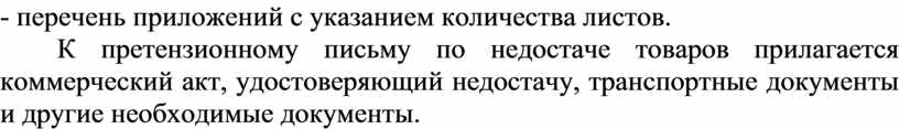 К претензионному письму по недостаче товаров прилагается коммерческий акт, удостоверяющий недостачу, транспортные документы и другие необходимые документы.