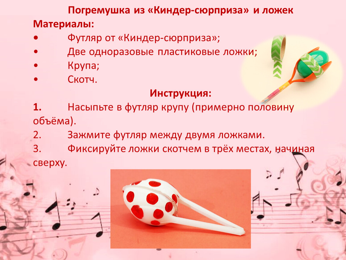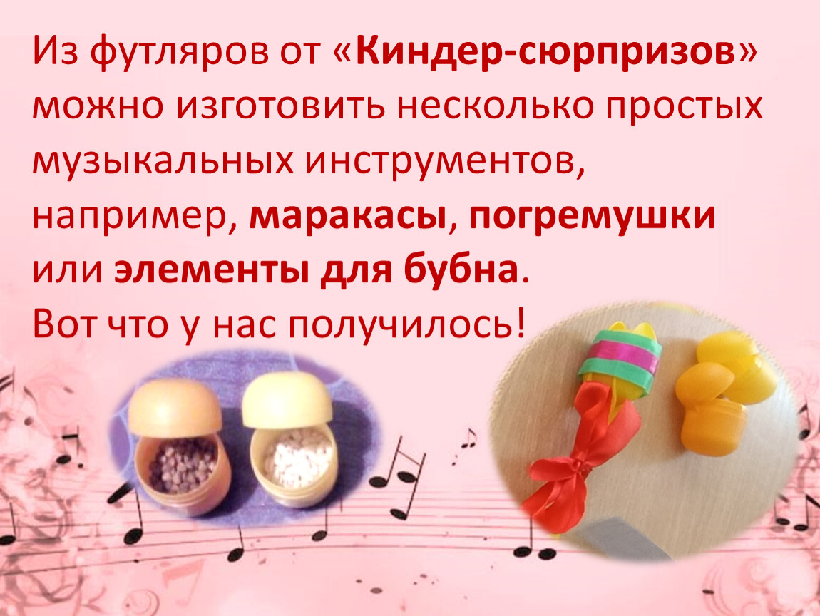 Из футляров от «Киндер-сюрпризов» можно изготовить несколько простых музыкальных инструментов, например, маракасы, погремушки