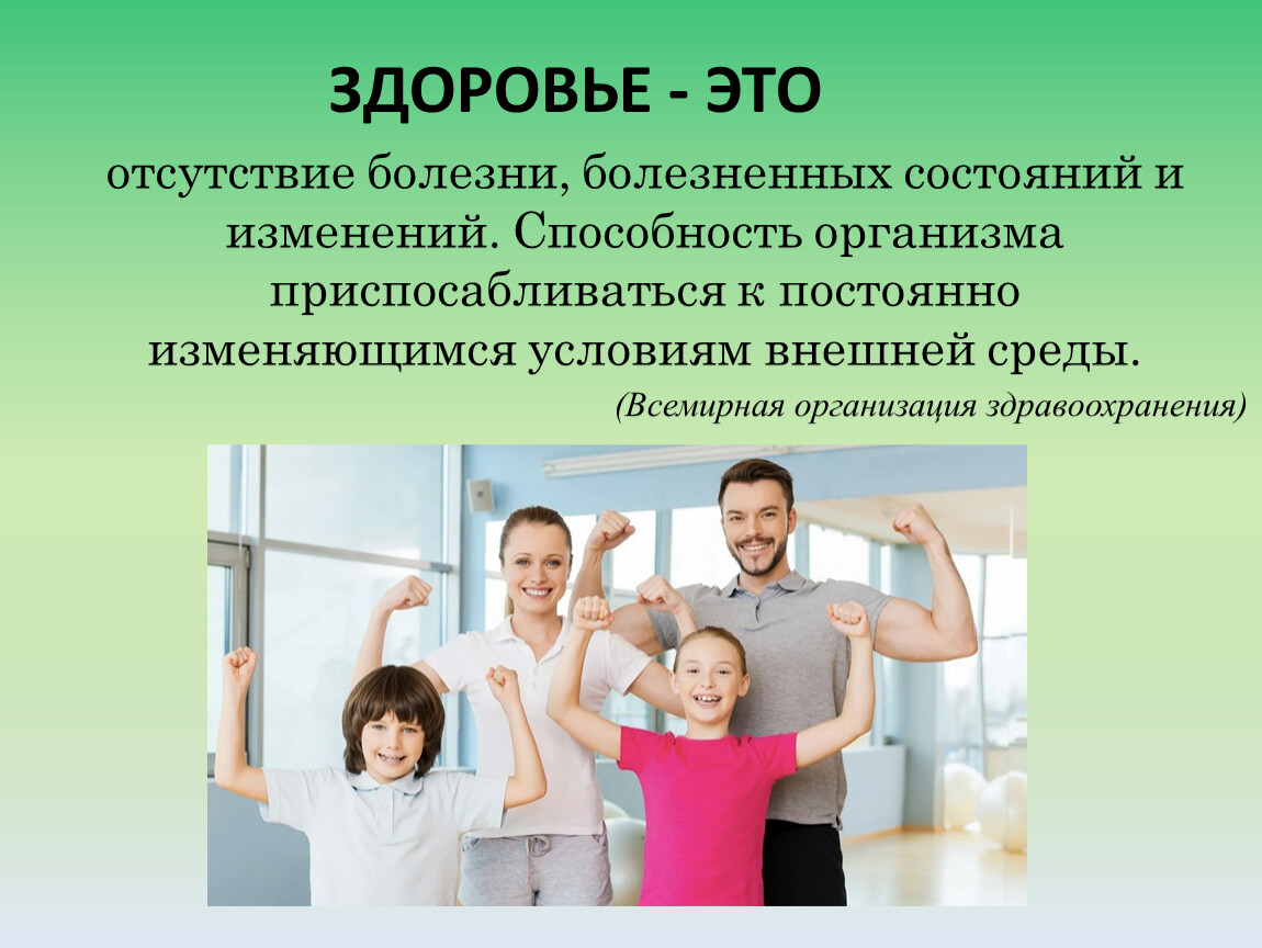 отсутствие болезни, болезненных состояний и изменений. Способность организма приспосабливаться к постоянно изменяющимся условиям внешней среды.