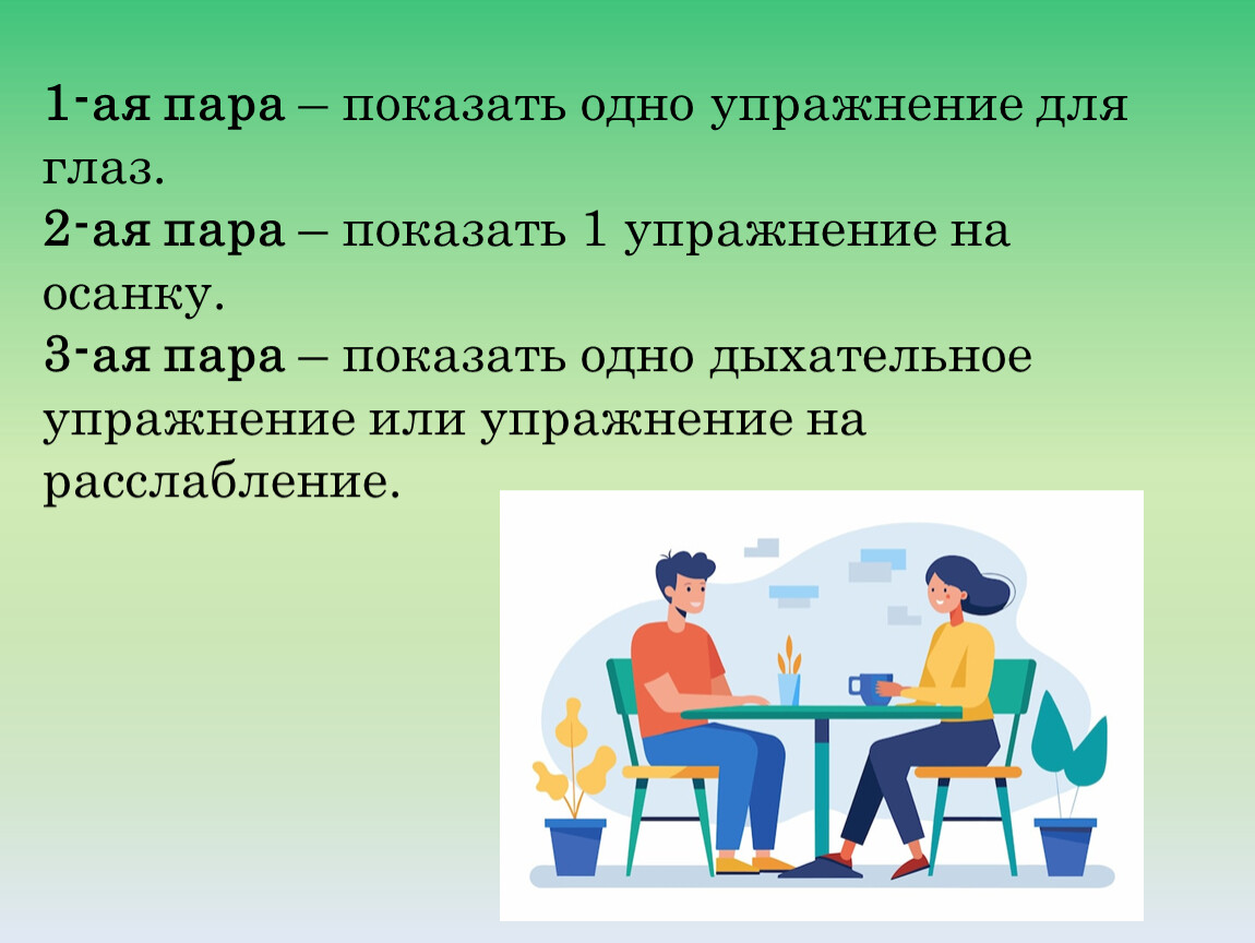 1-ая пара – показать одно упражнение для глаз. 2-ая пара – показать 1 упражнение на осанку. 3-ая пара – показать одно дыхательное упражнение или упражнение на расслабление.