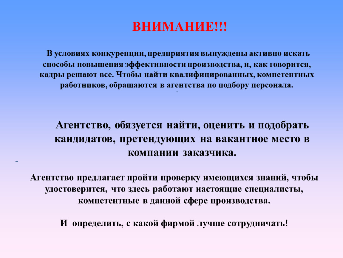 В условиях конкуренции, предприятия вынуждены активно искать способы повышения эффективности производства, и, как говорится, кадры решают все. Чтобы найти квалифицированных, компетентных работников, обращаются в агентства по подбору персонала.