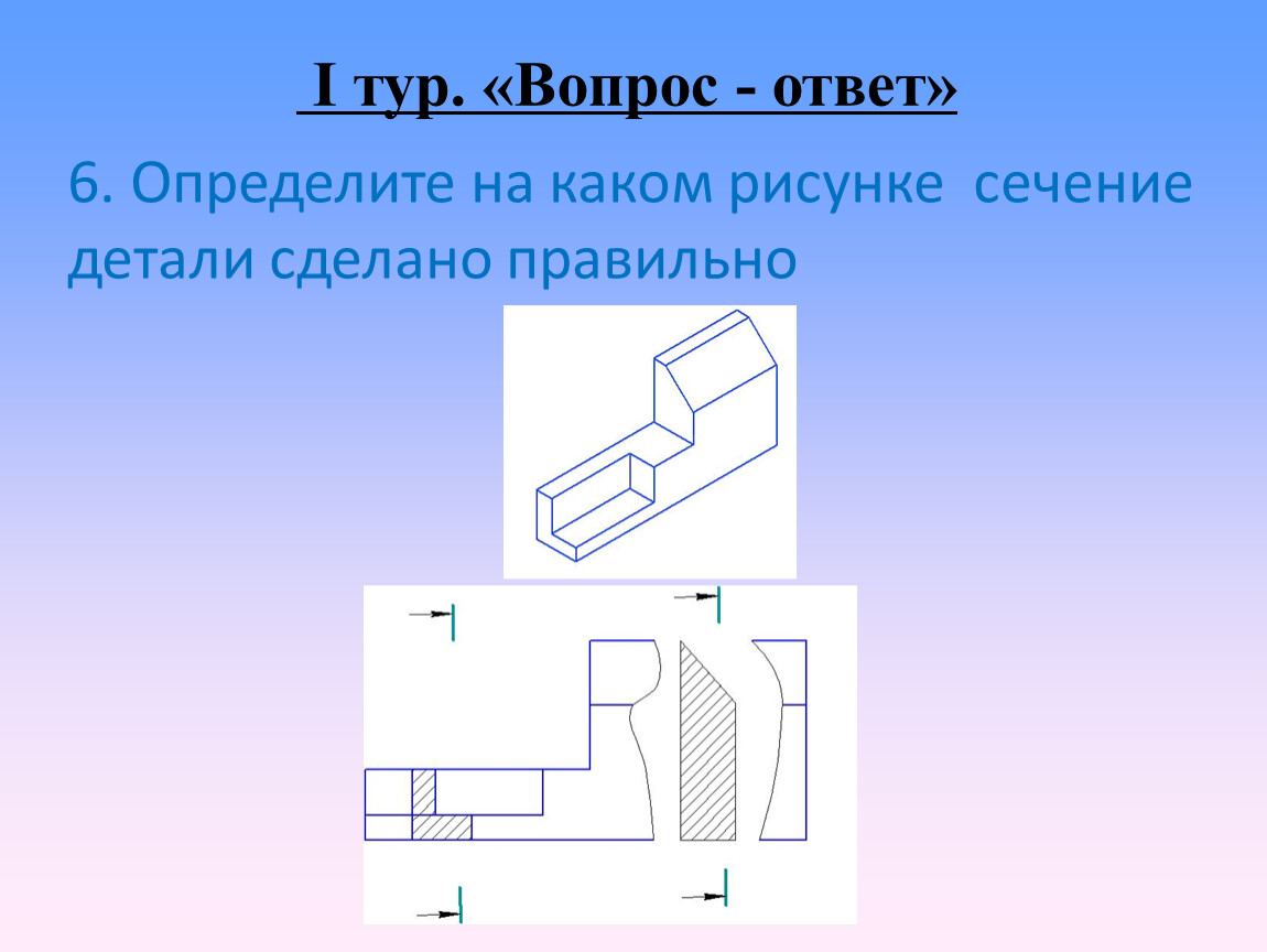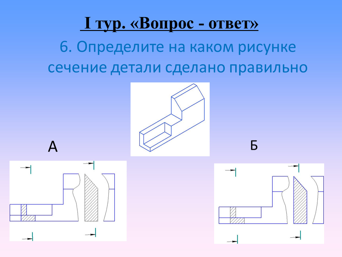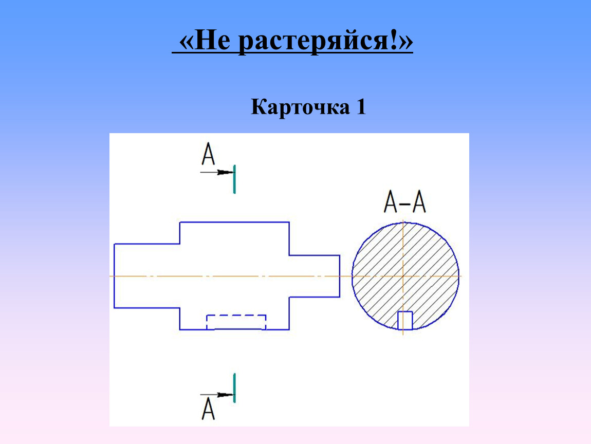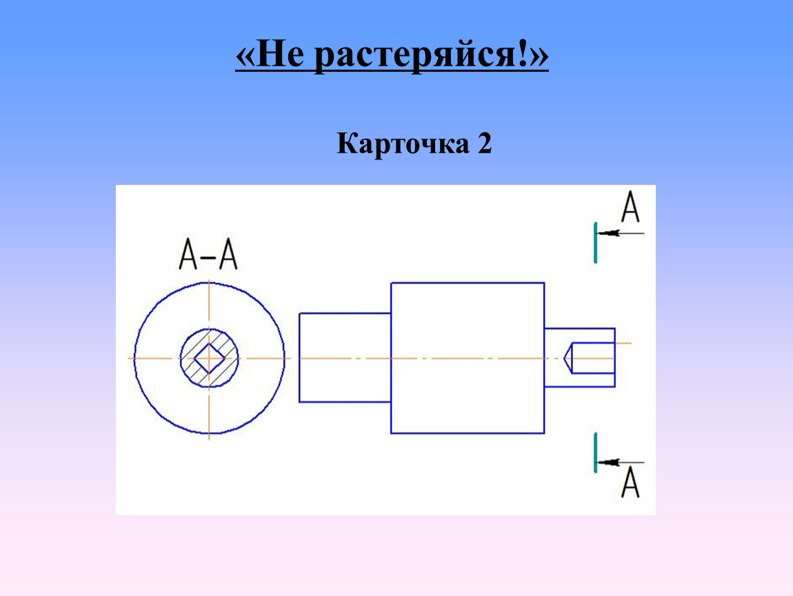 Каждой команде выдается по конверту с карточками, на которых изображены вид и сечения детали. На виде и сечениях есть ошибки, которые можно исправить. Также необходимо добавить недостающее изображение местного разреза. Предлагается участникам выполнить чертеж в тетради с внесенными изменениями и проверить не следующем уроке.