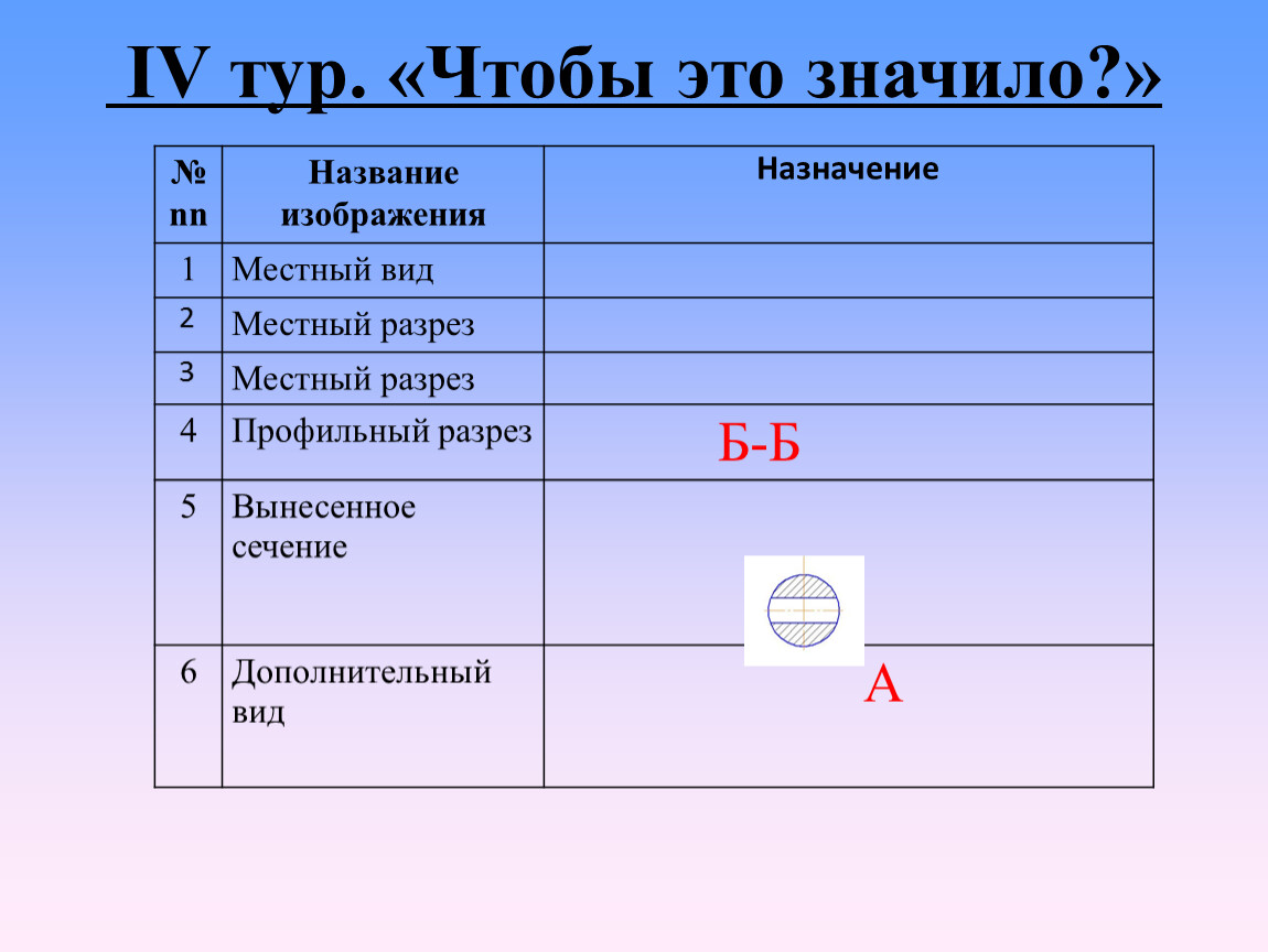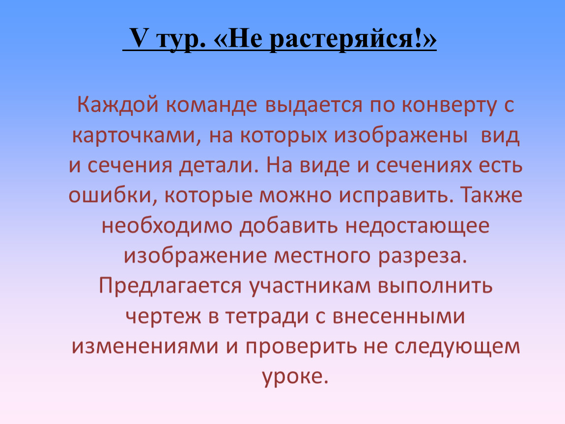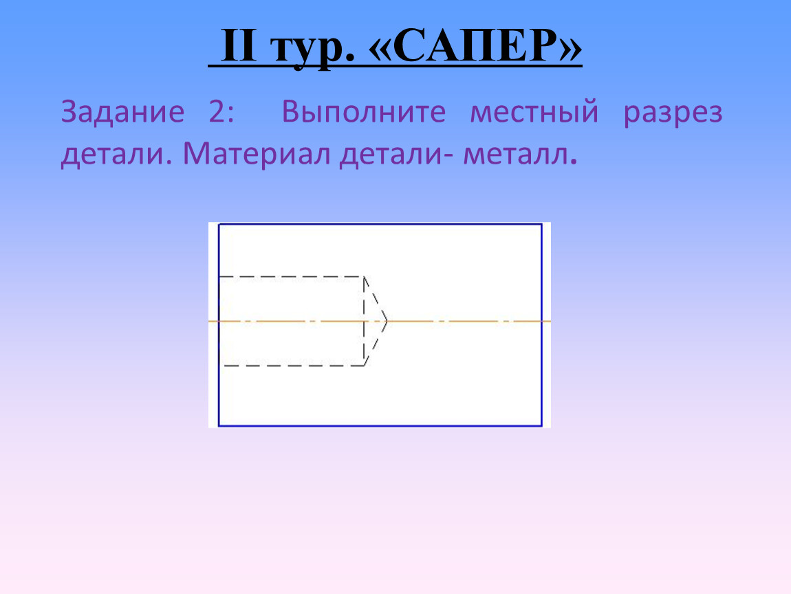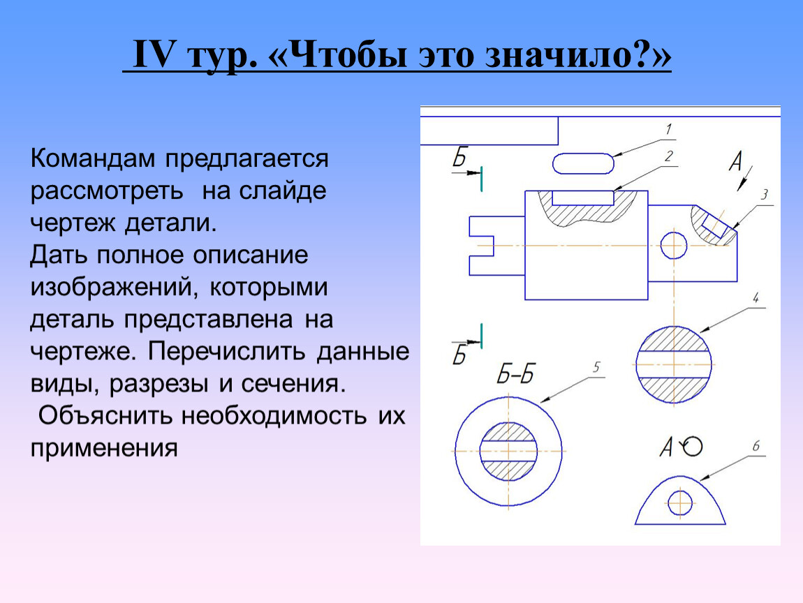 Каждой команде выдается по конверту с карточками, на которых изображены вид и сечения детали. На виде и сечениях есть ошибки, которые можно исправить. Также необходимо добавить недостающее изображение местного разреза. Предлагается участникам выполнить чертеж в тетради с внесенными изменениями и проверить не следующем уроке.