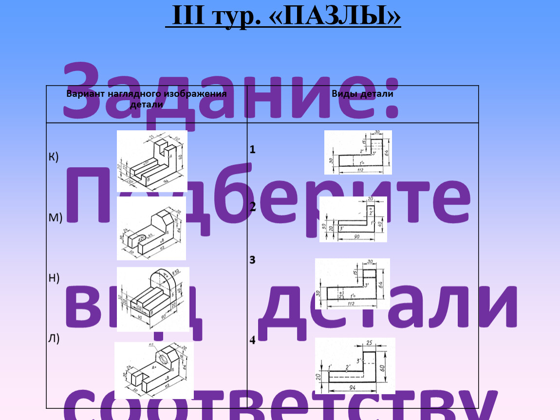 Задание: Подберите вид детали соответствующий её наглядному изображению