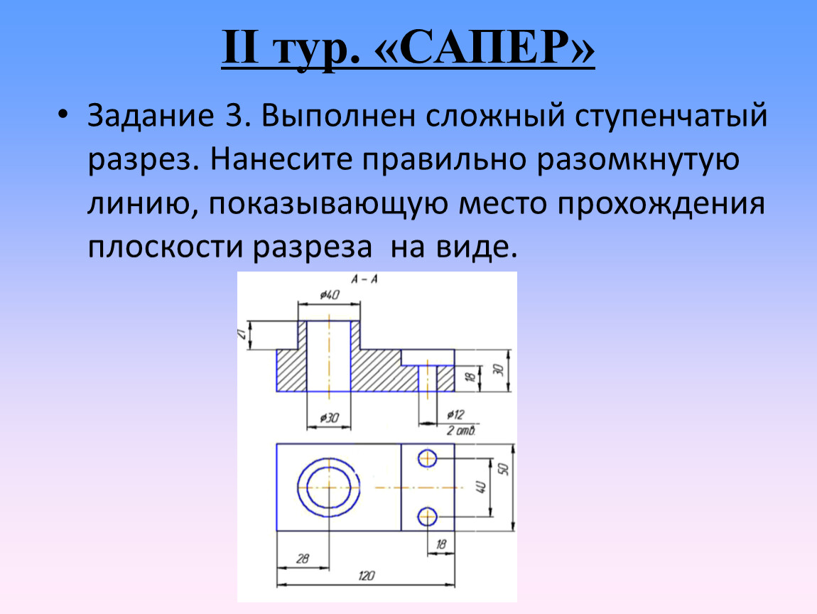 Задание 3. Выполнен сложный ступенчатый разрез. Нанесите правильно разомкнутую линию, показывающую место прохождения плоскости разреза на виде.