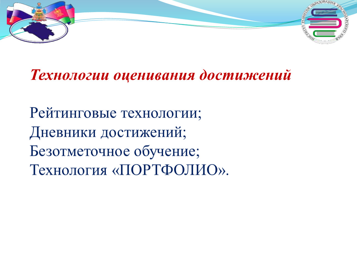 Технологии оценивания достижений Рейтинговые технологии;Дневники достижений;Безотметочное обучение;Технология «ПОРТФОЛИО».