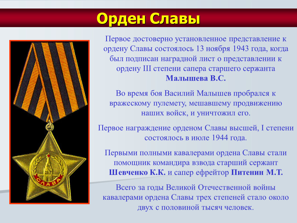 Первое достоверно установленное представление к ордену Славы состоялось 13 ноября 1943 года, когда был подписан наградной лист о представлении к ордену III степени сапера старшего сержанта Малышева В.С.
