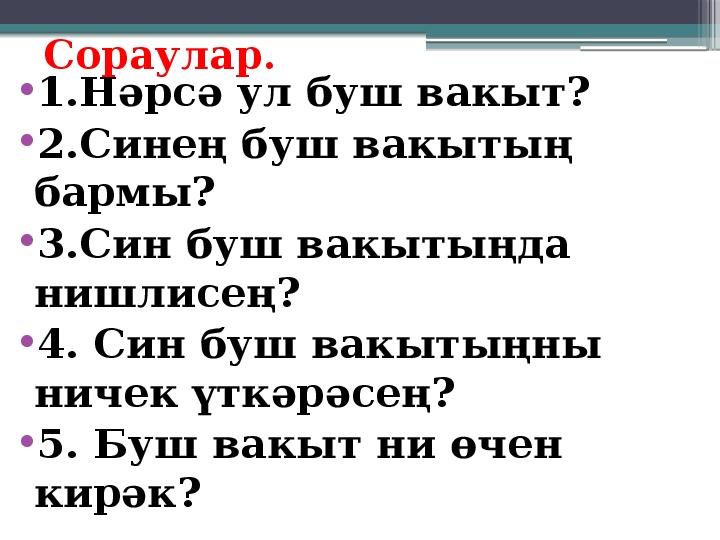 Сораулар. •1.Нәрсә ул буш вакыт? •2.Синең буш вакытың бармы? •3.Син буш вакытыңда нишлисең? •4. Син буш вакытыңны ничек үткәрәсең? •5. Буш вакыт ни өчен кирәк?