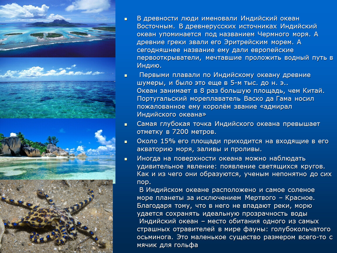 Первыми плавали по Индийскому океану древние шумеры, и было это еще в 5-м тыс. до н. э..Океан занимает в 8 раз большую площадь, чем Китай. Португальский мореплаватель Васко да Гама носил пожалованное ему королём звание «адмирал Индийского океана»