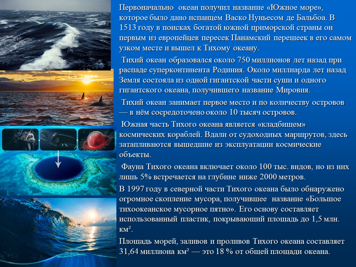 Первоначально океан получил название «Южное море», которое было дано испанцем Васко Нуньесом де Бальбоа. В 1513 году в поисках богатой южной приморской страны он первым из европейцев пересек Панамский перешеек в его самом узком месте и вышел к Тихому океану.