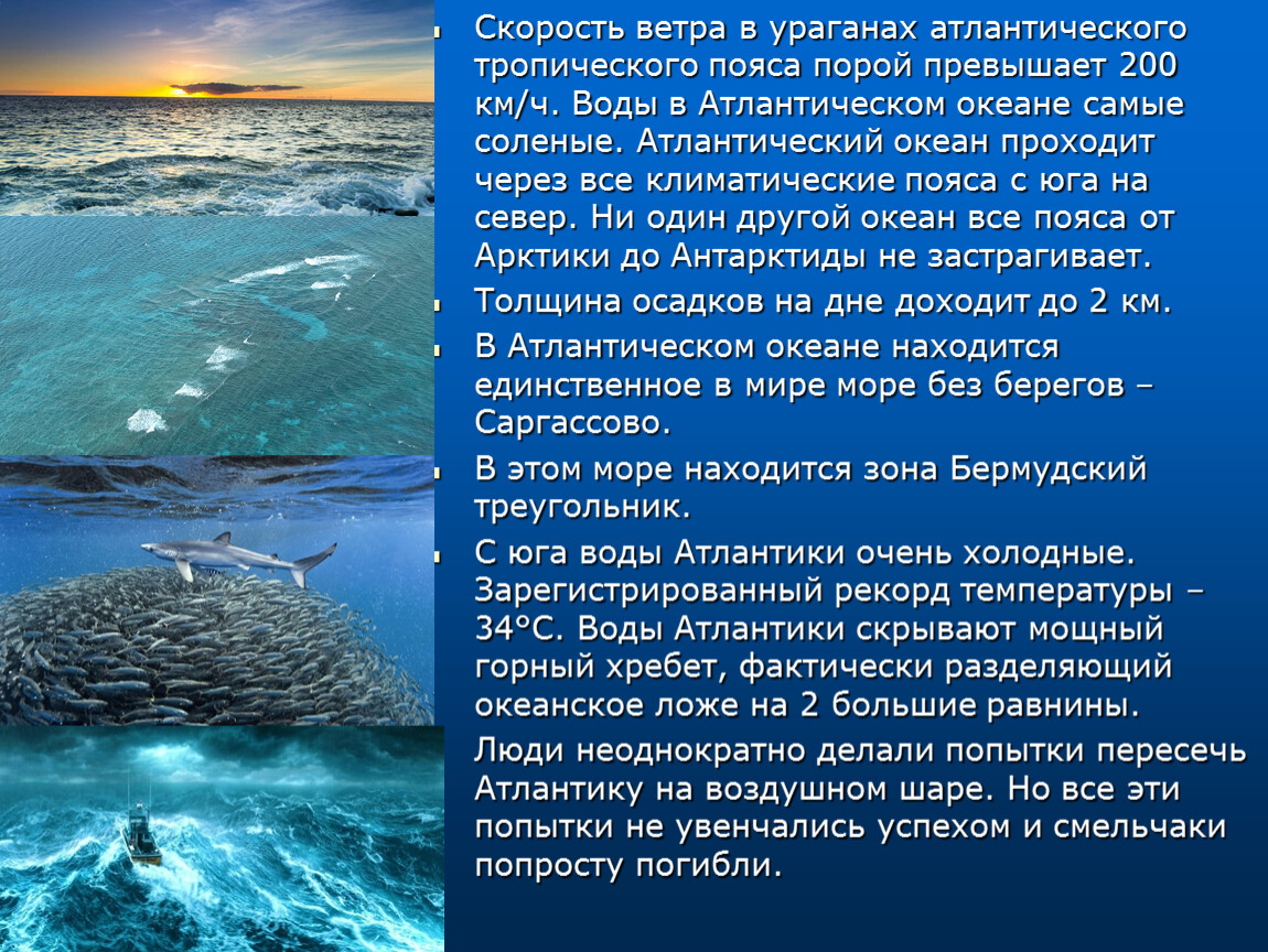 Скорость ветра в ураганах атлантического тропического пояса порой превышает 200 км/ч. Воды в Атлантическом океане самые соленые. Атлантический океан проходит через все климатические пояса с юга на север. Ни один другой океан все пояса от Арктики до Антарктиды не застрагивает.