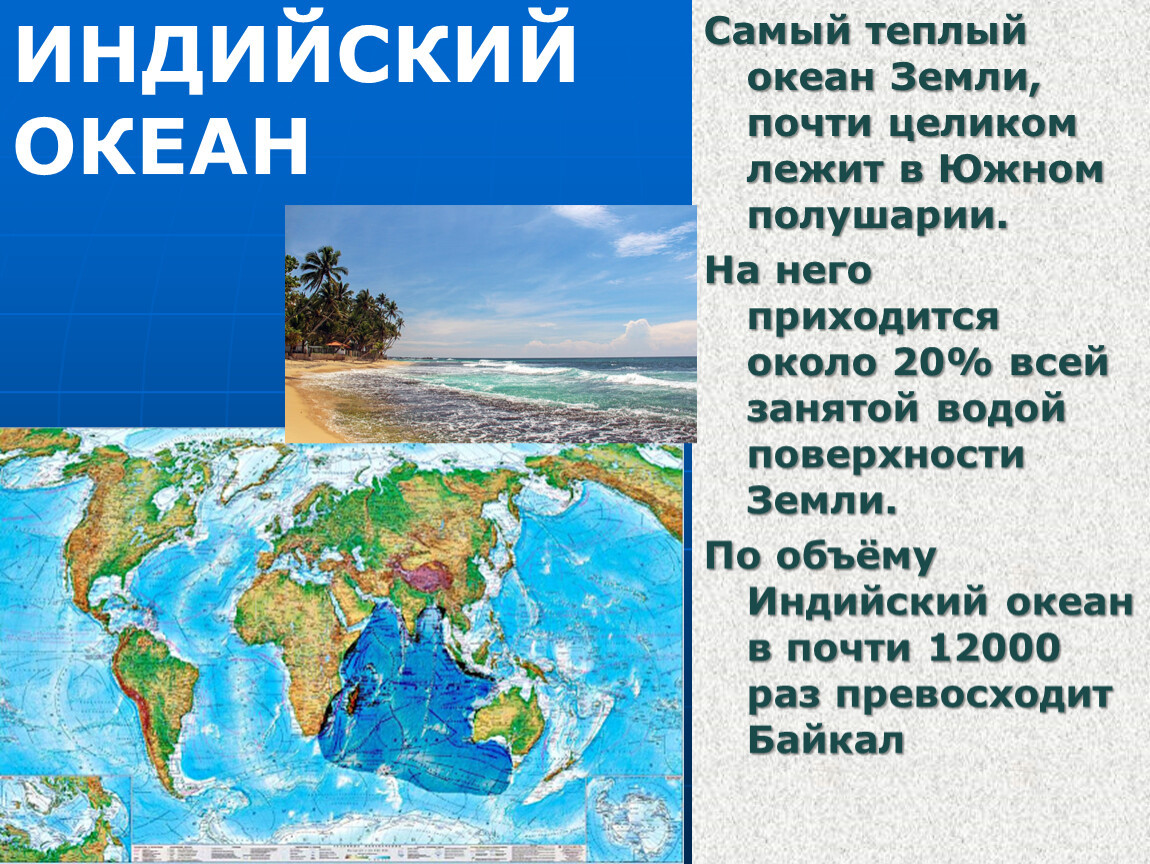 Самый теплый океан Земли, почти целиком лежит в Южном полушарии.