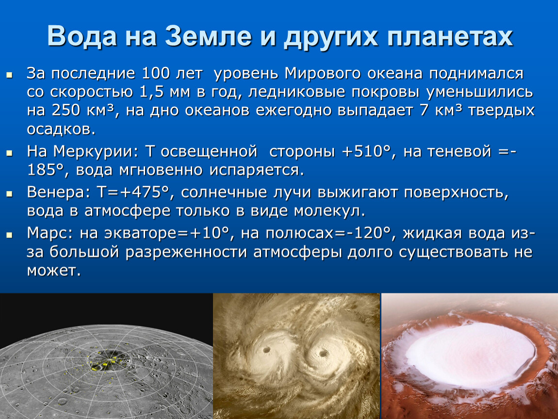 На Меркурии: Т освещенной стороны +510°, на теневой =-185°, вода мгновенно испаряется.