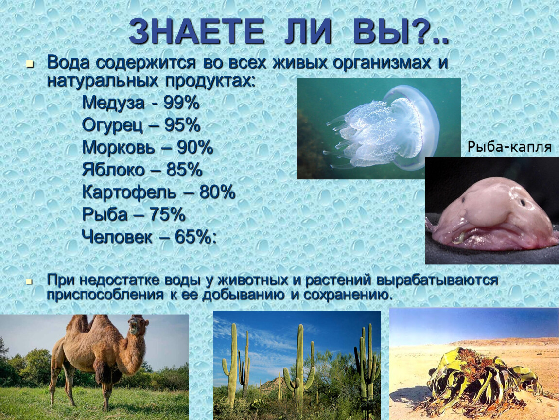 Вода содержится во всех живых организмах и натуральных продуктах: