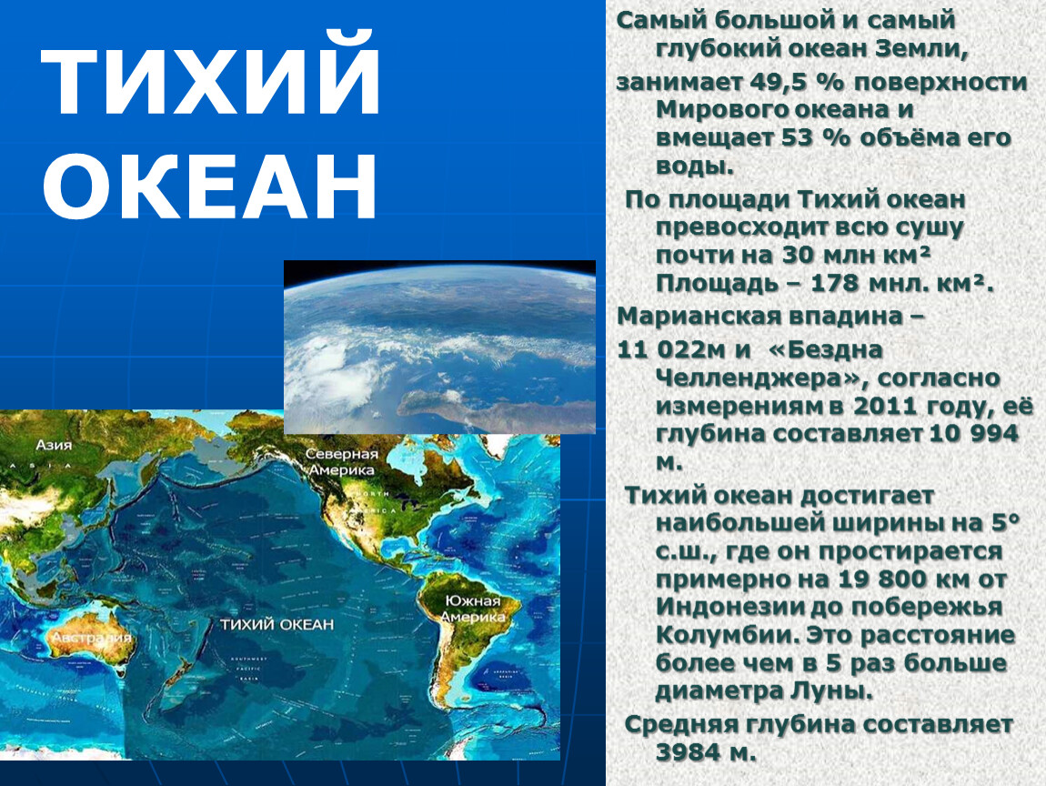 По площади Тихий океан превосходит всю сушу почти на 30 млн км² Площадь – 178 мнл. км².