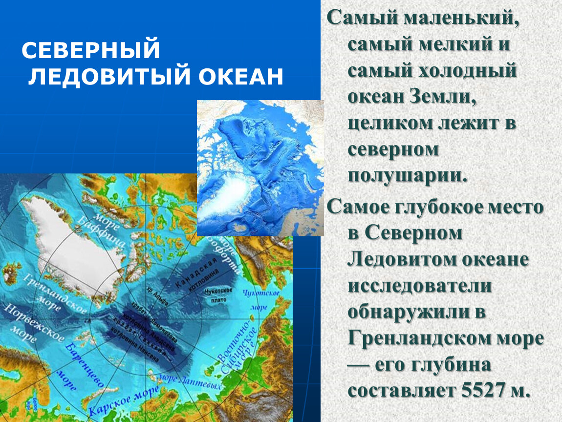 Самый маленький, самый мелкий и самый холодный океан Земли, целиком лежит в северном полушарии.