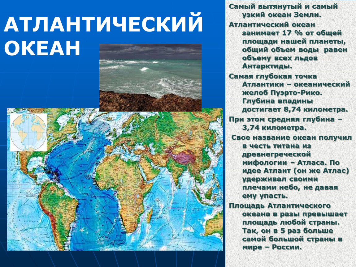 Атлантический океан занимает 17 % от общей площади нашей планеты, общий объем воды равен объему всех льдов Антарктиды.