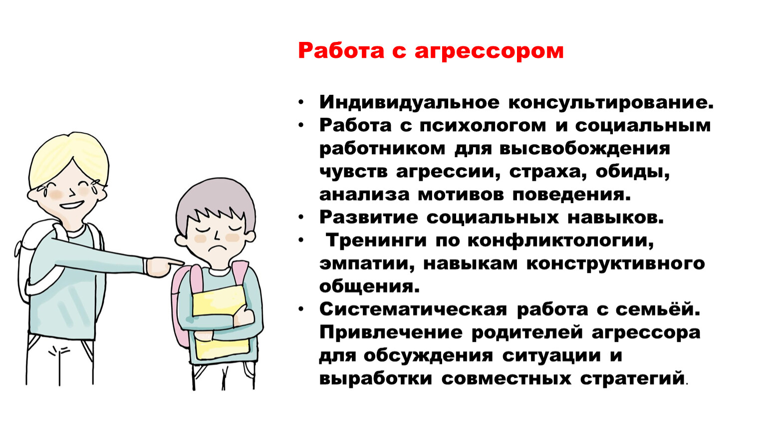 Систематическая работа с семьёй. Привлечение родителей агрессора для обсуждения ситуации и выработки совместных стратегий.