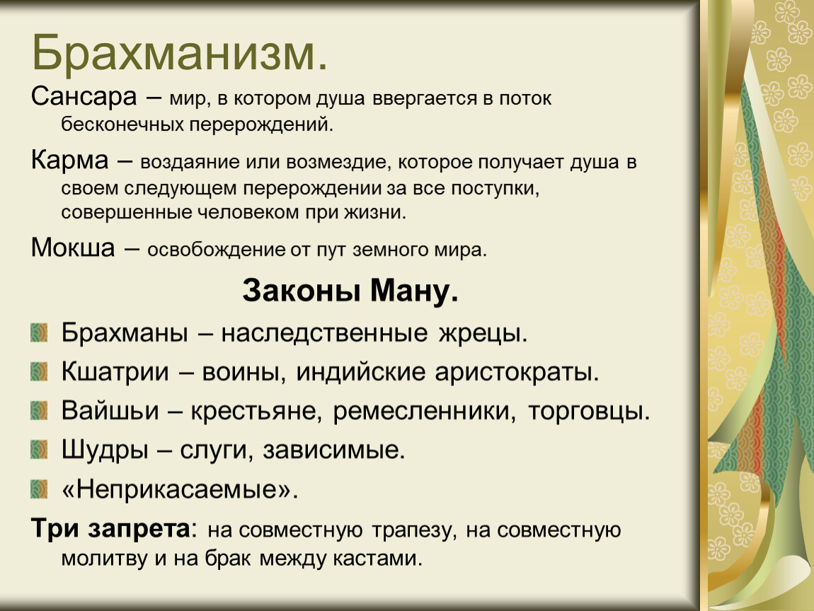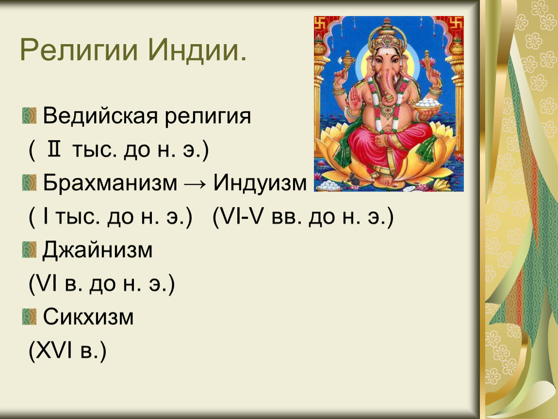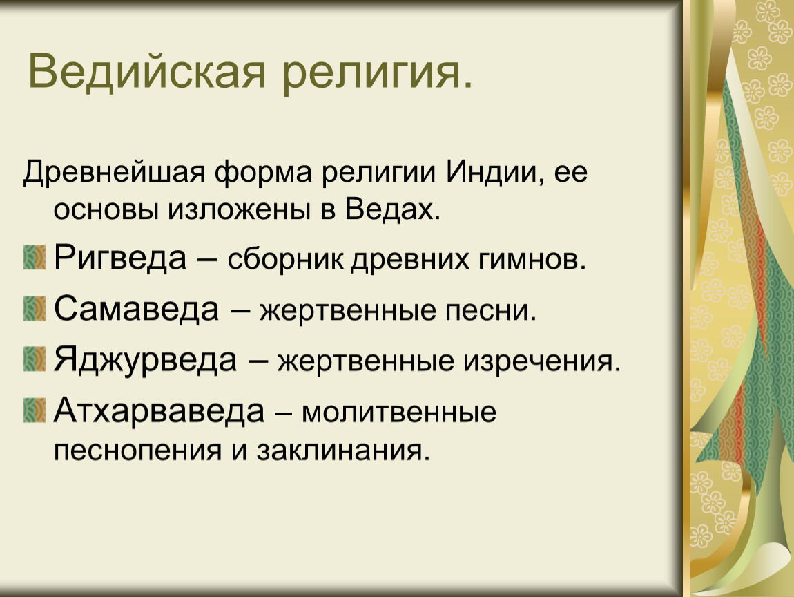 Древнейшая форма религии Индии, ее основы изложены в Ведах.