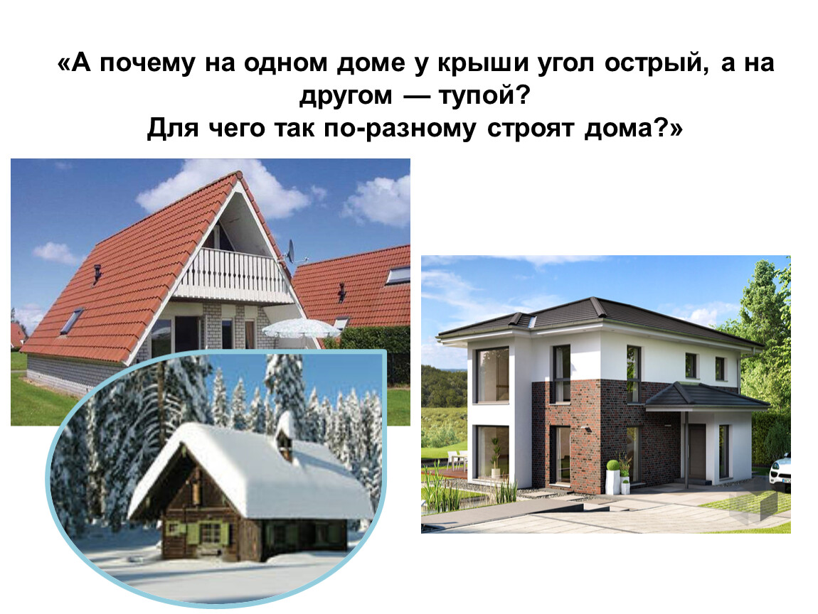 «А почему на одном доме у крыши угол острый, а на другом — тупой? Для чего так по-разному строят дома?»