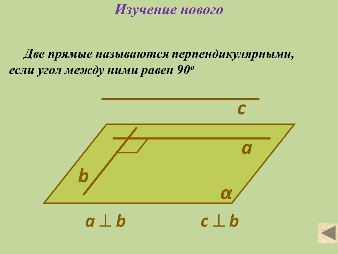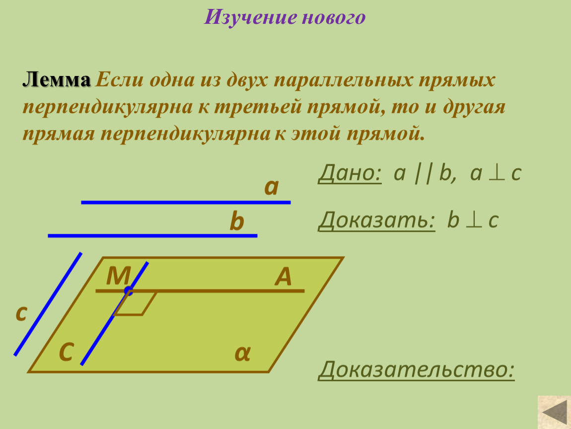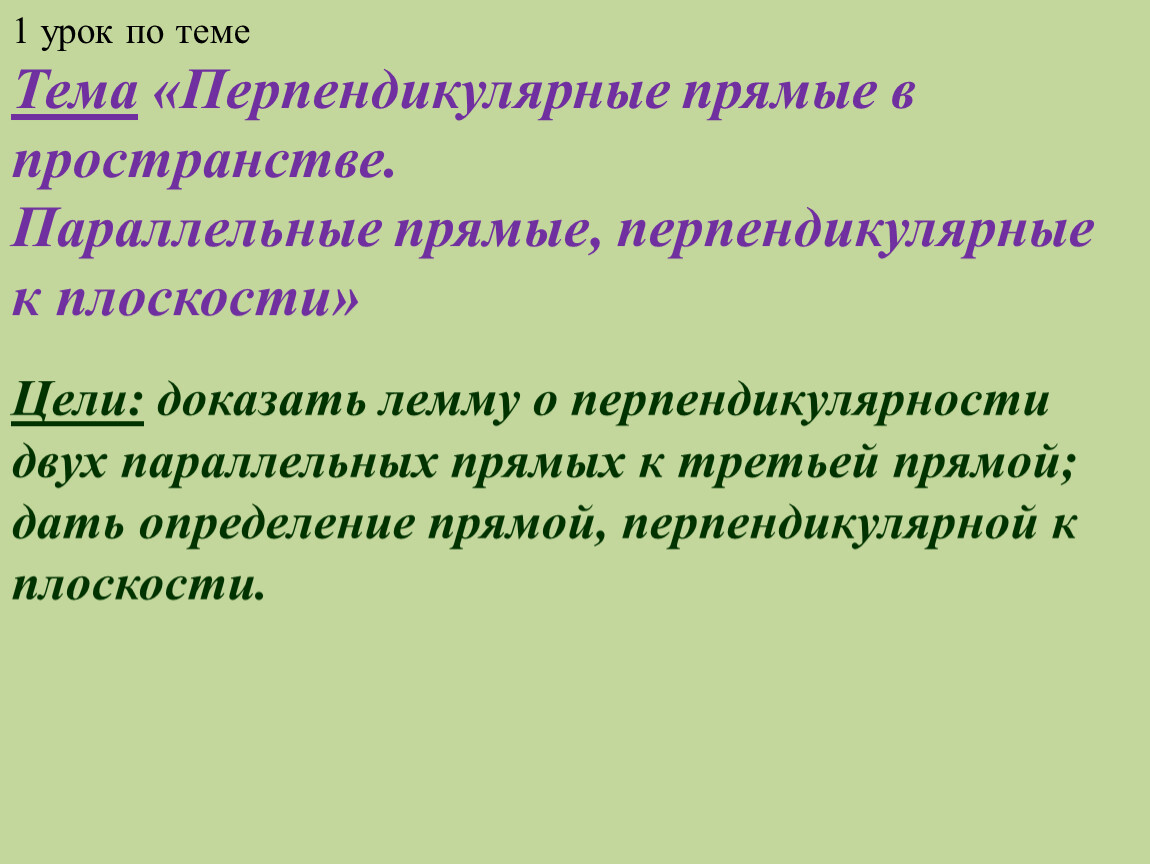 Цели: доказать лемму о перпендикулярности двух параллельных прямых к третьей прямой; дать определение прямой, перпендикулярной к плоскости.