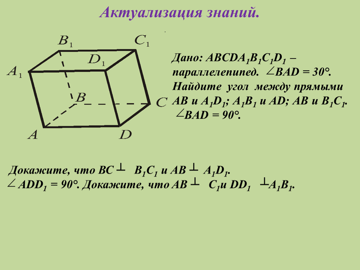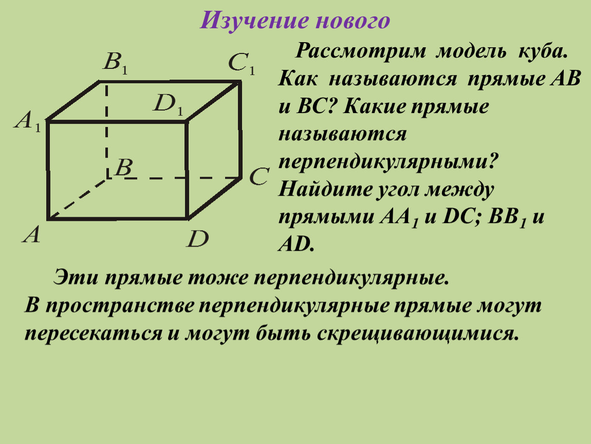 Рассмотрим модель куба. Как называются прямые АВ и ВС? Какие прямые называются перпендикулярными? Найдите угол между прямыми АА1 и DC; ВВ1 и AD.