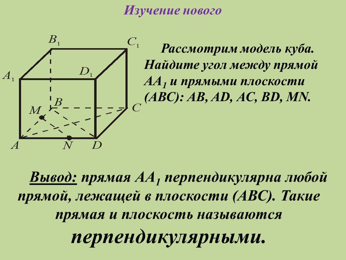 Вывод: прямая АА1 перпендикулярна любой прямой, лежащей в плоскости (АВС). Такие прямая и плоскость называются перпендикулярными.