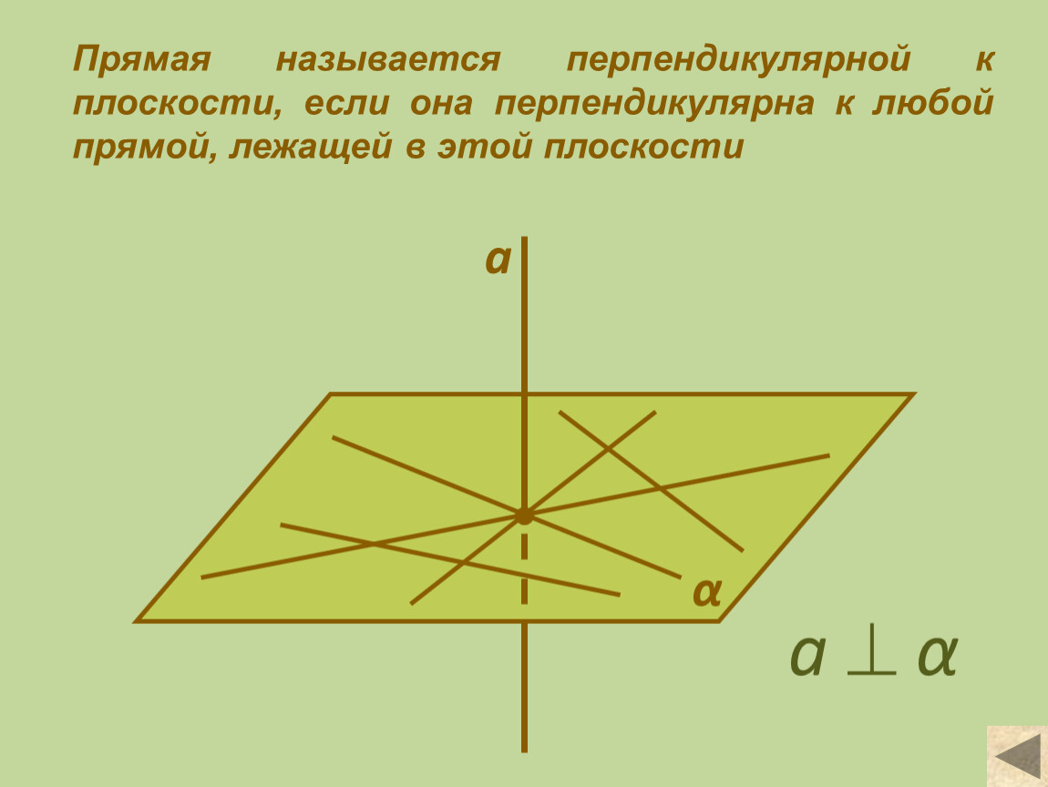 Прямая называется перпендикулярной к плоскости, если она перпендикулярна к любой прямой, лежащей в этой плоскости