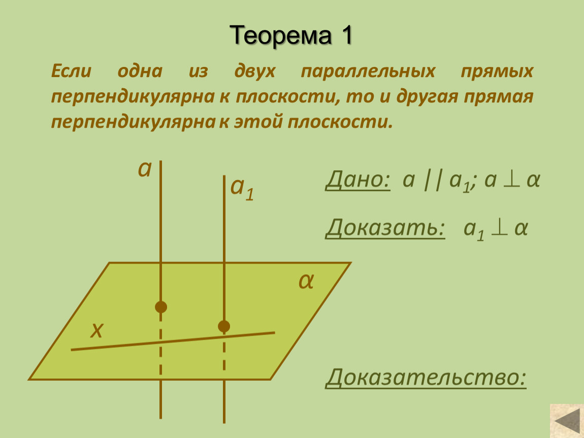 Если одна из двух параллельных прямых перпендикулярна к плоскости, то и другая прямая перпендикулярна к этой плоскости.
