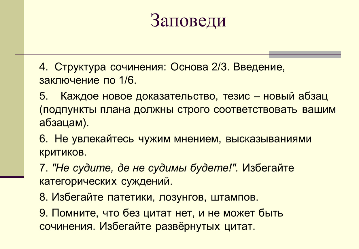 9. Помните, что без цитат нет, и не может быть сочинения. Избегайте развёрнутых цитат.