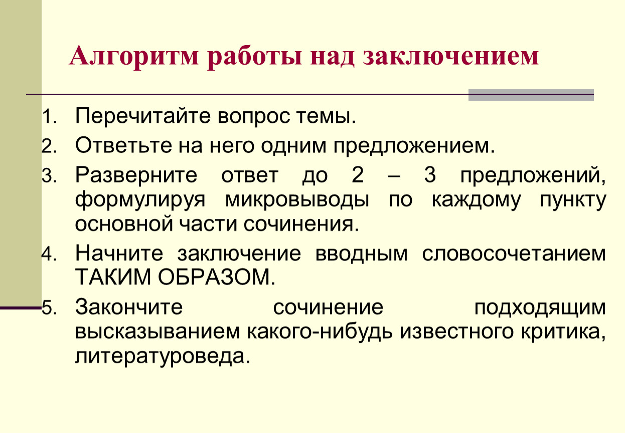 Алгоритм работы над заключением