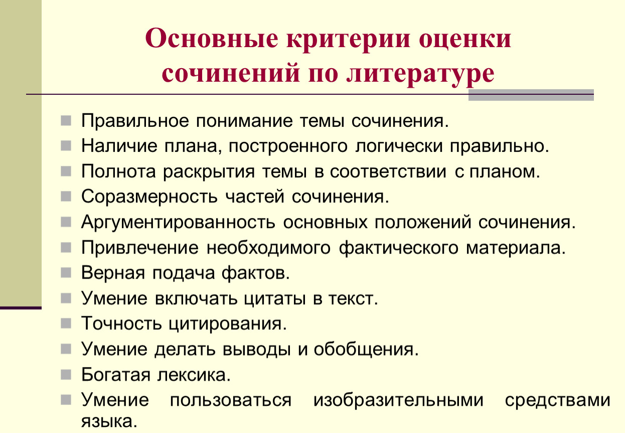 Основные критерии оценки сочинений по литературе