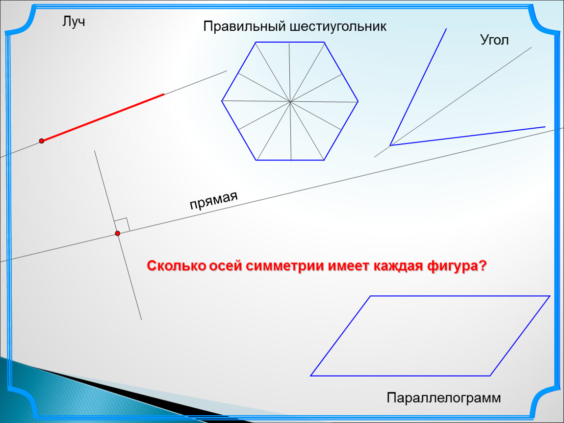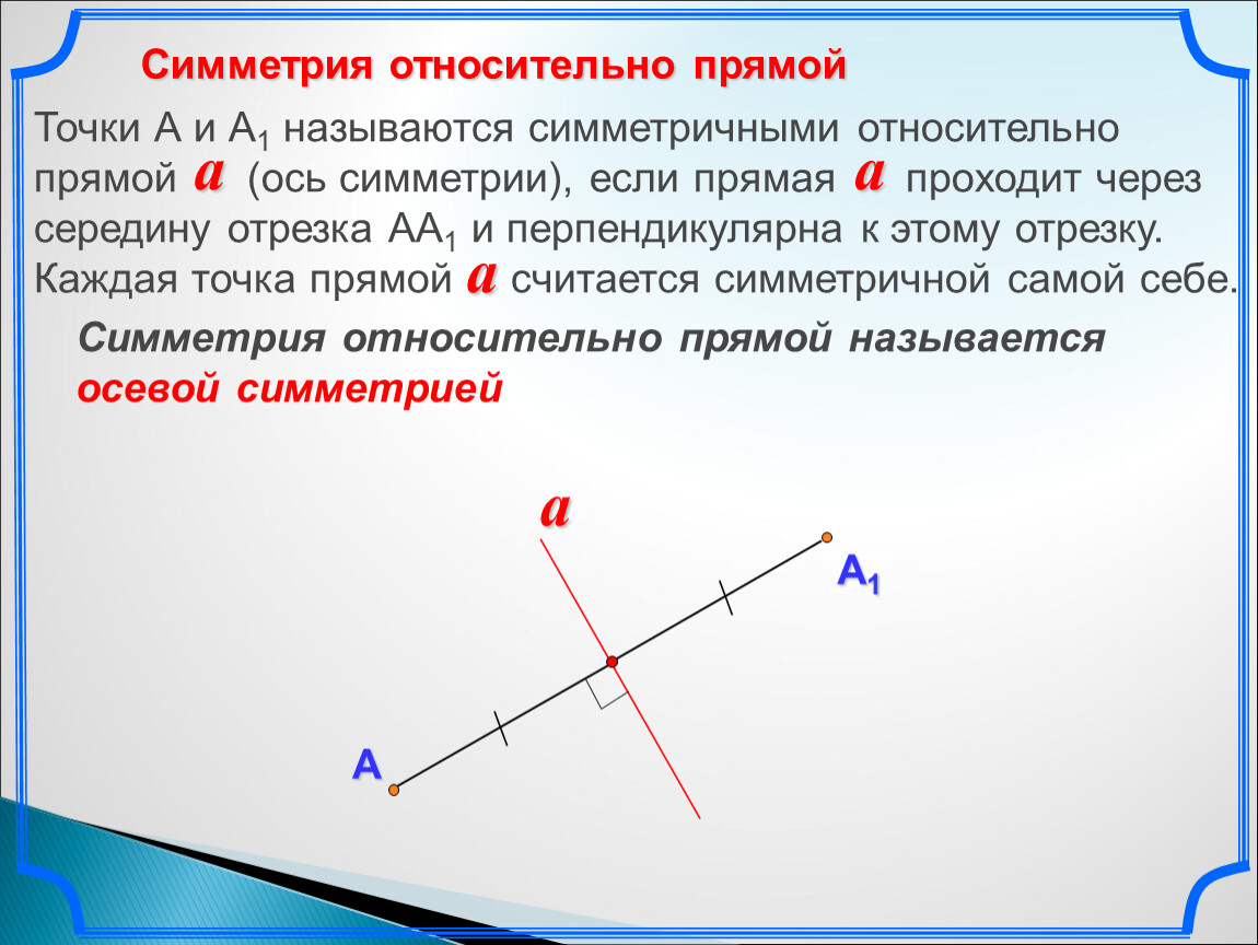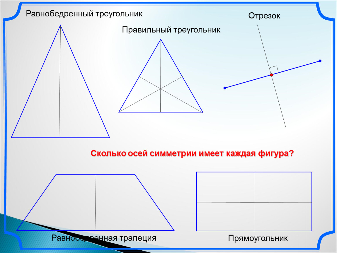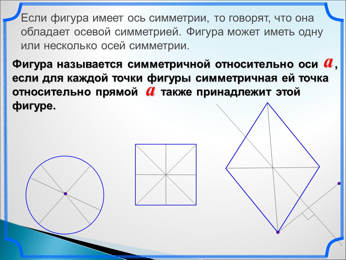 Если фигура имеет ось симметрии, то говорят, что она обладает осевой симметрией. Фигура может иметь одну или несколько осей симметрии.