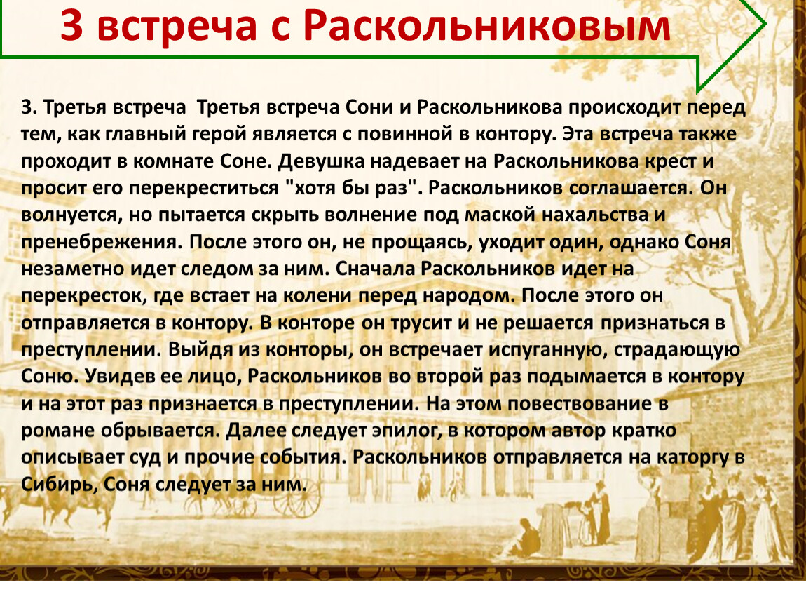 3. Третья встреча Третья встреча Сони и Раскольникова происходит перед тем, как главный герой является с повинной в контору. Эта встреча также проходит в комнате Соне. Девушка надевает на Раскольникова крест и просит его перекреститься "хотя бы раз". Раскольников соглашается. Он волнуется, но пытается скрыть волнение под маской нахальства и пренебрежения. После этого он, не прощаясь, уходит один, однако Соня незаметно идет следом за ним. Сначала Раскольников идет на перекресток, где встает на колени перед народом. После этого он отправляется в контору. В конторе он трусит и не решается признаться в преступлении. Выйдя из конторы, он встречает испуганную, страдающую Соню. Увидев ее лицо, Раскольников во второй раз подымается в контору и на этот раз признается в преступлении. На этом повествование в романе обрывается. Далее следует эпилог, в котором автор кратко описывает суд и прочие события. Раскольников отправляется на каторгу в Сибирь, Соня следует за ним.